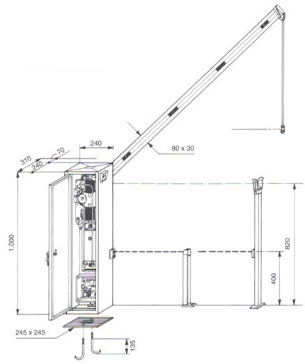 Pri instalaciji/montaži treba učvrstiti stupić za betonsku čvrstu podlogu. Ukoliko ta potloga ne postoji, potrebno je napraviti betonski temelj dimenzija 40 x 40 x 30 (dužina x širina x dubina). Potrebno je napraviti kanal u koji se spusti lanac. Ugrađuje se žaljezni lim U profila dimenzija 40 x 40 mm (širina x dubina). Kanal se postavlja između stupa s pogonskim elektromotorom i stupa s protuutegom. Nakon što se iskopa kanal za postavljanje navedenog profila, u njega se osim profila postavlja i UTP cat5e u cijev CS20 (poradi komunikacije fotoćelija).