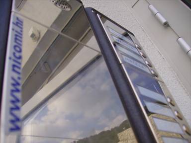 Primjer tipkovnice sa pozivom za 1 stan serije 4000 (antivandal steel) U ponudi tvrtke Nicomi se nalaze audio kompleti, za 1 ili 2 stana sa jednim ili dva ulaza. Na slici je prikaz audio kita za 1 stan (aluminijska vetzija tipkovnice). Primjer instalirane audio tipkovnice (serija 4000 antivandal steel)